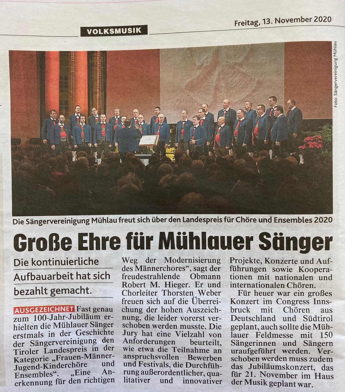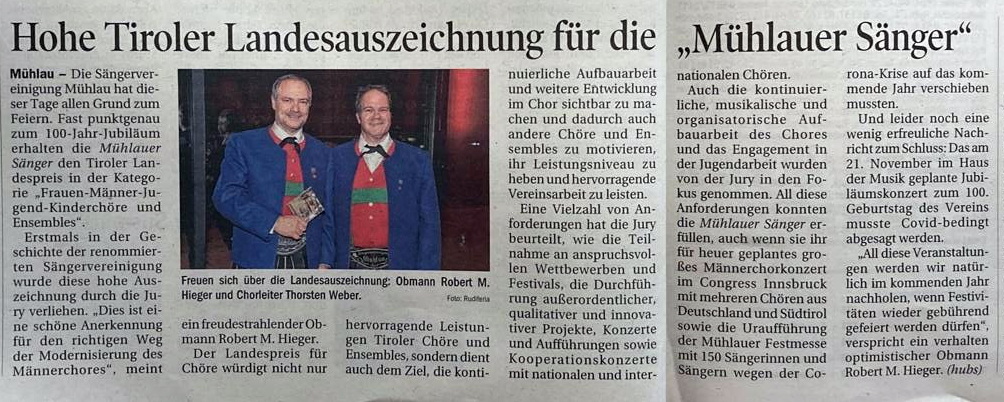 Fast punktgenau zum 100-Jahr-Jubiläum erhalten die Mühlauer Sänger den Tiroler Landespreis in der Kategorie „Frauen-Männer-Jugend-Kinderchöre und Ensembles".